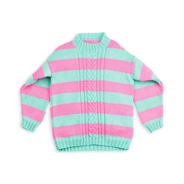 Inspired by the colorful and unique style of the 80s, this long, knit pullover is super cute and comfy. Stitched in Red Heart Super Saver, this vividly striped garment is worked in stocking stitch with a bold cable panel on the center front. It's a great pattern for practicing stocking stitch, ribbing, cables, and more. Explore all the colors in this durable yarn for a sweater that will look vibrant season after season.