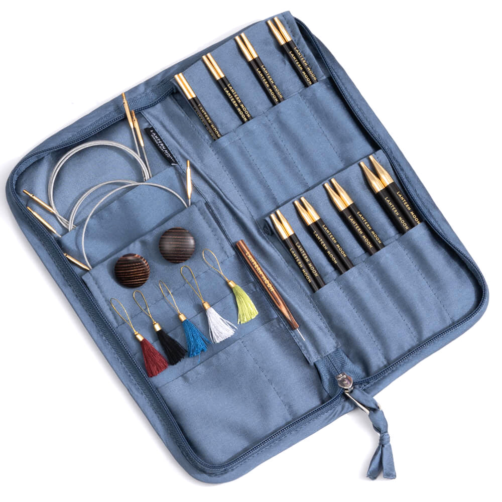 This set of interchangeable knitting pins contains: 8 pairs of 13cm (5in) interchangeable tips in sizes, 3.0, 3.5, 4.0, 4.5, 5.0, 5.5, 6.0, & 8.0mm: 3 nylon-coated, stainless steel swivel cords in sizes 60, 80 and 100cm (cord length denotes complete needle length); 4 wooden end caps, 2 tightening tools and 5 colourful tassel stitch markers. Everything comes in a beautiful embroidered Khadi soft silk zippered case to keep your knitting needles safely stored and organised. The knitting pins are made from ebony wood, sourced from Indian government authorised wood stock yards.