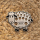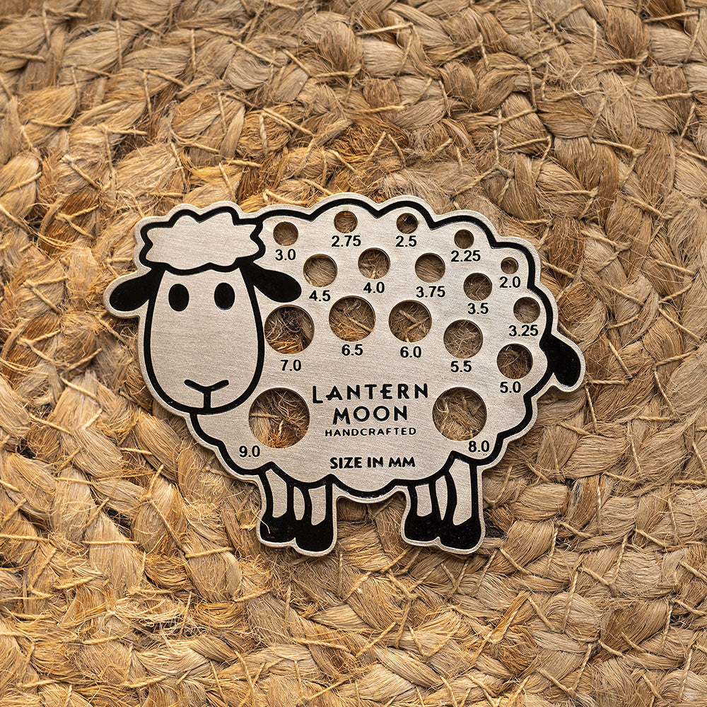 Sheep-shaped silver-plated metallic needle gauge is printed front and back, one side metric and the other imperial measurements. The perfect tool to measure your needles.