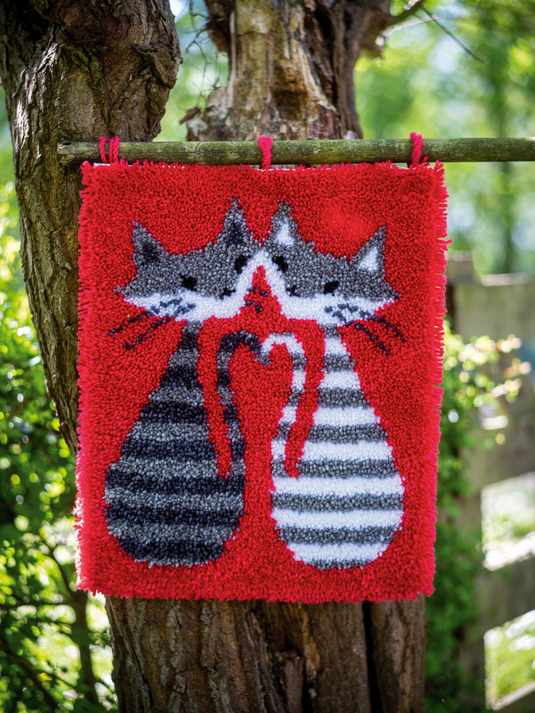 Latch hook rug kit. Kit includes: hand painted, large hole canvas; acrylic cut yarn packs; latch hook; front-sheet picture and instructions in eight languages (EN, NL, FR, GER, IT, SP, RU, SW). Approximate finished size: (w/h) 43 x 54cm or 17.2 x 21.6in. Difficulty level: easy. Age category: from 7 years. Stitches used: latch hook.
