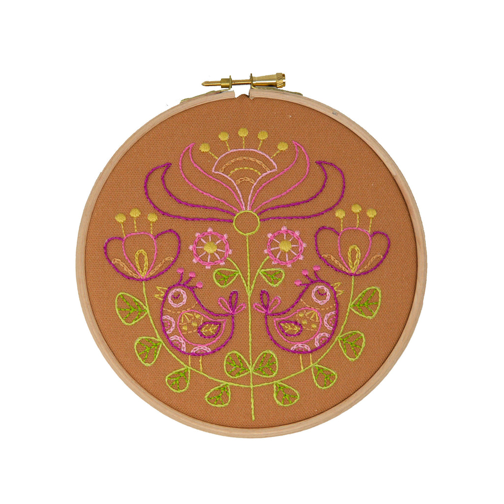 These beautiful Folk Art inspired embroidery kits come with everything you need to stitch and frame your design.  The fabric is printed with the design to be embroidered and the included stitch guide shows you how to stitch each part of the design with illustrated stitch diagrams.